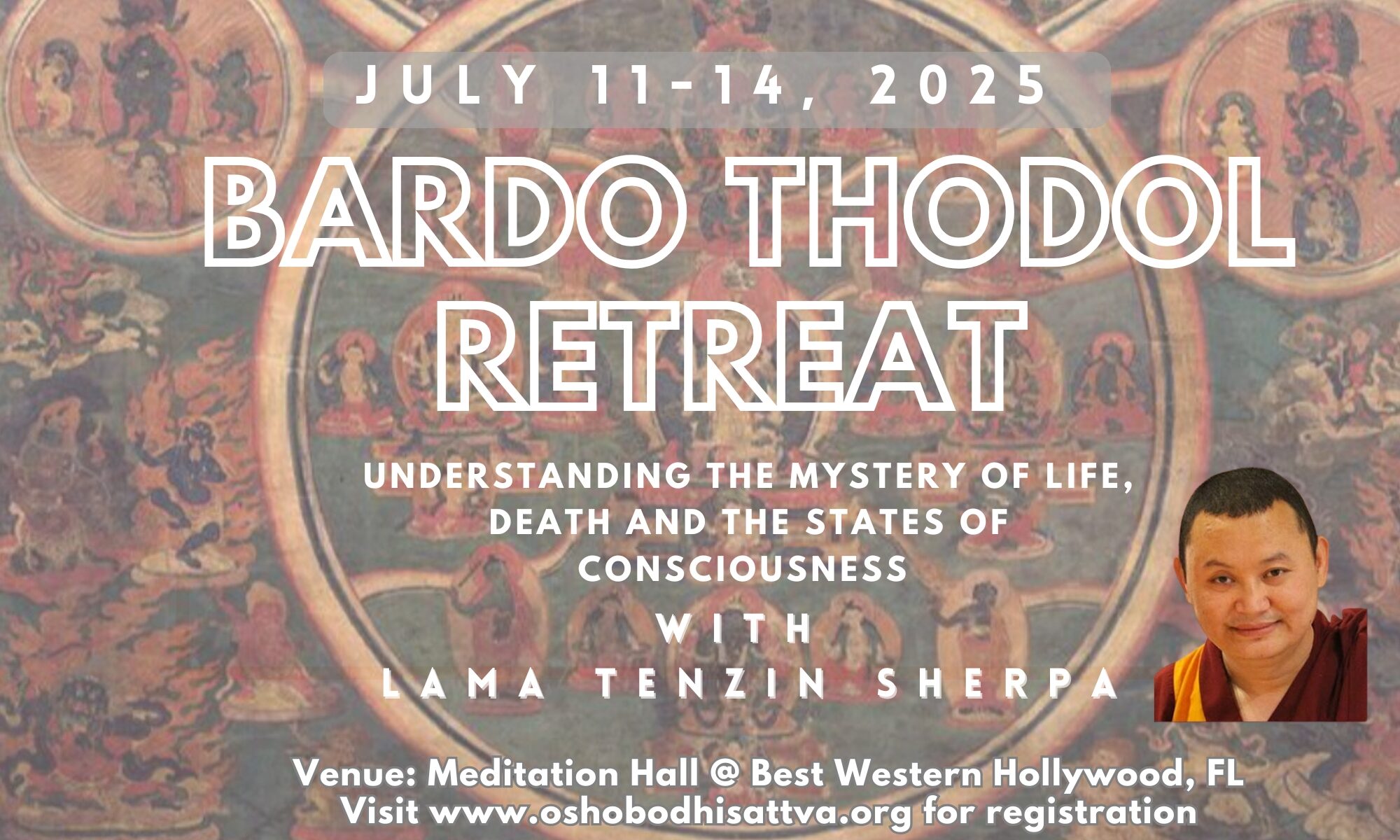 We are very happy to share this much awaited Bardo Thodol retreat with Lama Tenzin Sherpa. We had a very powerful Vipassana Meditation Retreat with Lama ji in 2023 in our meditation hall in Hallandale beach, FL and this year we are blessed with another powerful Tibetan technique of Bardo Thodol. Bardo is a Tibetan term for transitional state of consciousness at the moment of dying.